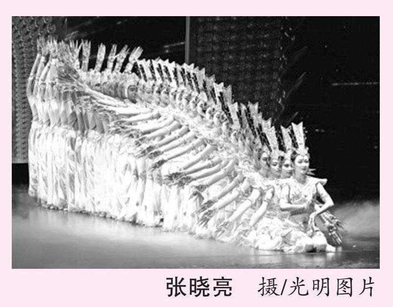 2025年6月8日,创排升级、全面提升观演效果的大型情景音画剧《千手千眼》开启今年在甘肃敦煌驻场的首场演出。该剧以中国残疾人艺术团音乐舞蹈诗《我的梦》为蓝本,依托莫高窟第3窟等敦煌壁画元素创编而成,通过音乐、舞蹈、多媒体等形式讲述了“妙善救父”的民间故事,向中外游客传递敦煌文化所蕴含的向上、向善、向美的人文精神。图为中国残疾人艺术团演员在甘肃敦煌大剧院表演大型情景音画剧《千手千眼》。