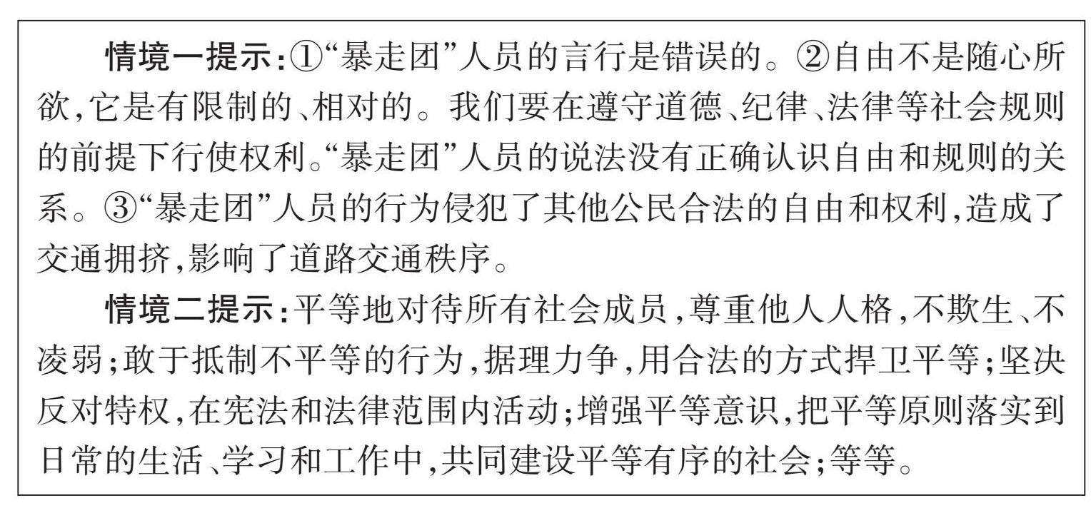 自主探究 情境一:一学生在去往公园途中,发现一群“暴走团”的人无视红绿灯指示,肆意穿行街道十字路口,造成一阵车辆拥堵。对于周围行人的指责,有“暴走团”人员大声回复:“这是我们的自由!” 探究:请你对“暴走团”人员的言行进行评析。 情境二:平等是人类的崇高理想,是社会发展的永恒主题。法律面前人人平等,是社会文明进步的标志,也是社会主义法治的基本原则之一。我国宪法规定:“中华人民共和国公民在法律