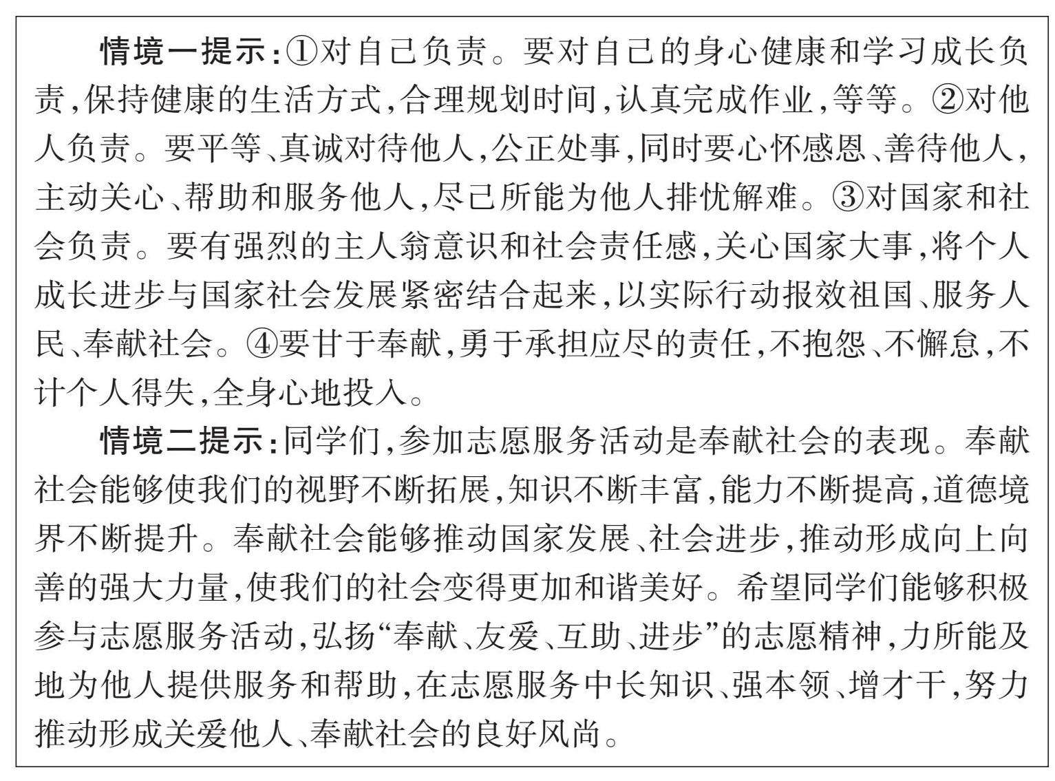自主探究 情境一:小伟在日记中写道:父母从小抚养、教育我;哥哥疼爱、关心我;老师指导我学习……还有许许多多的人,都在我成长过程中发挥着重要作用。我要学会担责,不辜负他们。 探究:小伟应该如何承担责任? 情境二:八年级(1)班准备组织同学们周末参加志愿服务活动,但是很多同学认为参加志愿服务活动对自己没有什么用,还耽误学习和娱乐的时间,不想去。 探究:作为班长的你应该如何劝说这些同学? [情