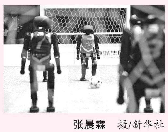 2025年6月28日,2025RoBoLeague机器人足球联赛决赛在北京举行,参赛机器人通过AI操控实现自主踢球。这既是2025世界人形机器人运动会首场测试赛,也是国内首场全自主3V3(3人对战3人)AI机器人足球赛。图为机器人选手在比赛中。