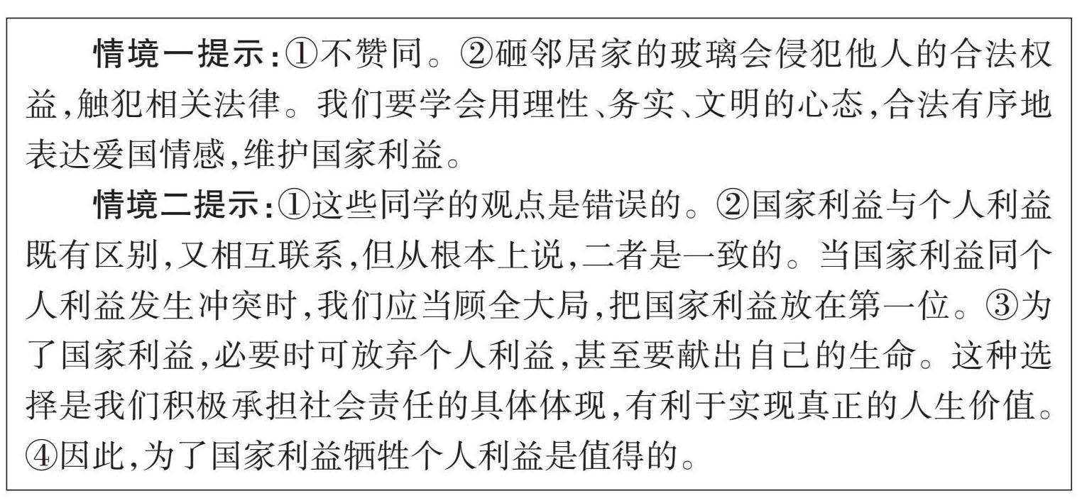 自主探究 情境一:小华的邻居发表了对国家不满的言论,小华非常愤怒,准备晚上砸邻居家的玻璃,以示警告。 探究:你赞同小华的做法吗?为什么? 情境二:上课时,老师讲到了个人利益与国家利益的关系这一知识点,很多同学认为,为了国家利益牺牲个人利益不值得。 探究:对此,请谈谈你的看法。 [情境一提示:①不赞同。②砸邻居家的玻璃会侵犯他人的合法权益,触犯相关法律。我们要学会用理性、务实、文明的心态,