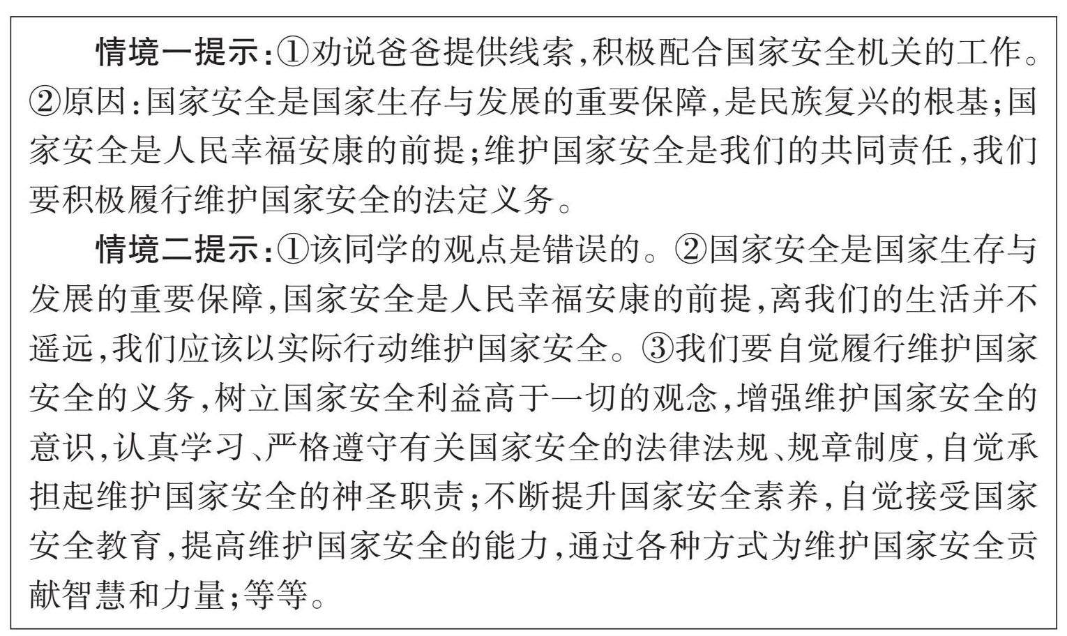自主探究 情境一:小伟的爸爸无意中发现某人正在泄露国家秘密,并且看清了对方的相貌,但是当国家安全机关征集线索时,爸爸却有所顾虑,不太想说…… 探究:对此,小伟应该如何做?请说明理由。 情境二:2025年5月12日,国务院新闻办公室发布《新时代的中国国家安全》白皮书,旨在全面阐释新时代中国国家安全工作的创新理念、生动实践和建设成果,增进国际社会对中国国家安全的认知和理解。有同学认为,国家安全离