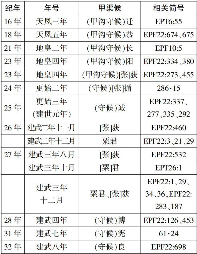 [摘要]新莽末年至东汉建武初年,张掖郡居延都尉府下辖甲渠候官经历了较为频繁的主官更迭,其中张获与粟君在甲渠候任上多次更替,其任职变动与当时河西的政治局势相关。居延新简“夏良致掾么书”册中的“候君”当为甲渠候粟君,书册记录了建武三年(27)十月匈奴大规模入寇甲渠候官,推测此次匈奴入寇为“建武三年十二月候粟君所责寇恩事”册所载粟君诉讼寇恩的直接原因,也对粟君的免职产生了影响。