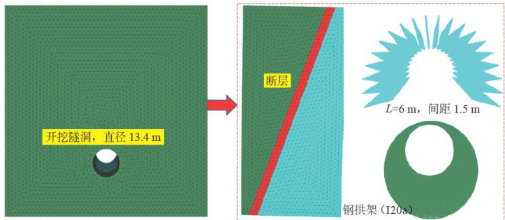 摘要:为研究大断面引水隧洞的围岩稳定性问题,以巴拉水电站跨断层大断面引水隧洞为研究对象,通过现场试验、数值模拟研究了原支护状态下围岩的失稳变形,得出了大断面引水隧洞的围岩变形机理,结合室内试验验证了NPR锚索的超常力学性能。结果表明:受断层破碎带的影响,研究区域的岩体节理裂隙较为发育,岩体完整性较差,隧洞围岩存在变形、坍塌的风险;采用普通锚杆与I20a 钢拱架耦合的支护方案,隧洞的最大位移仍然达到了约 391mm ,原支护措施无法有效约束隧洞围岩的变形;NPR锚索的恒阻力约为250~350kN ,具有良好的恒阻特性,可应用于软岩大变形隧洞的围岩支护。研究成果可为其他软岩隧洞的支护提供依据。